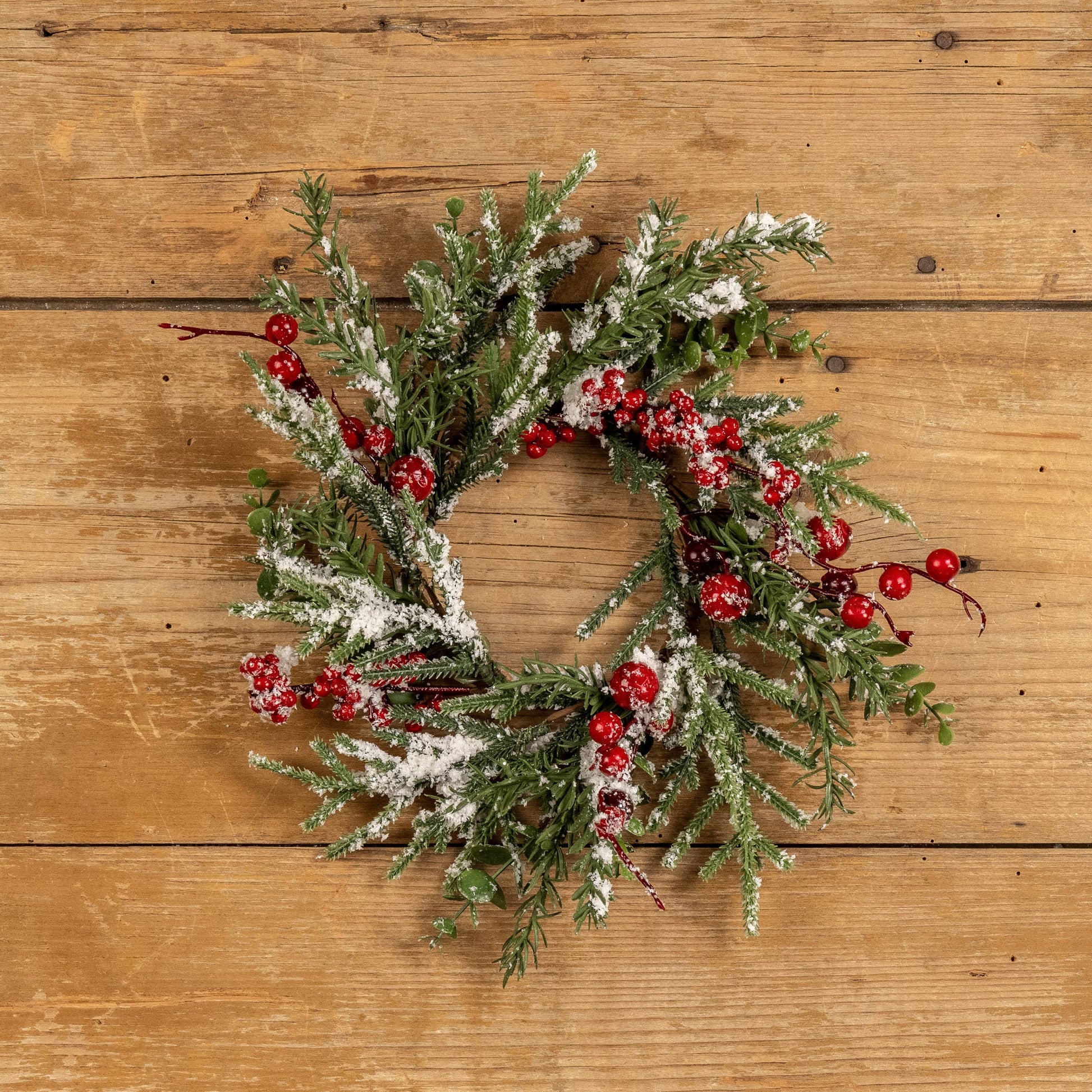 12" SNOWY EVERGREEN W/ RED BERRY CANDLE RING
