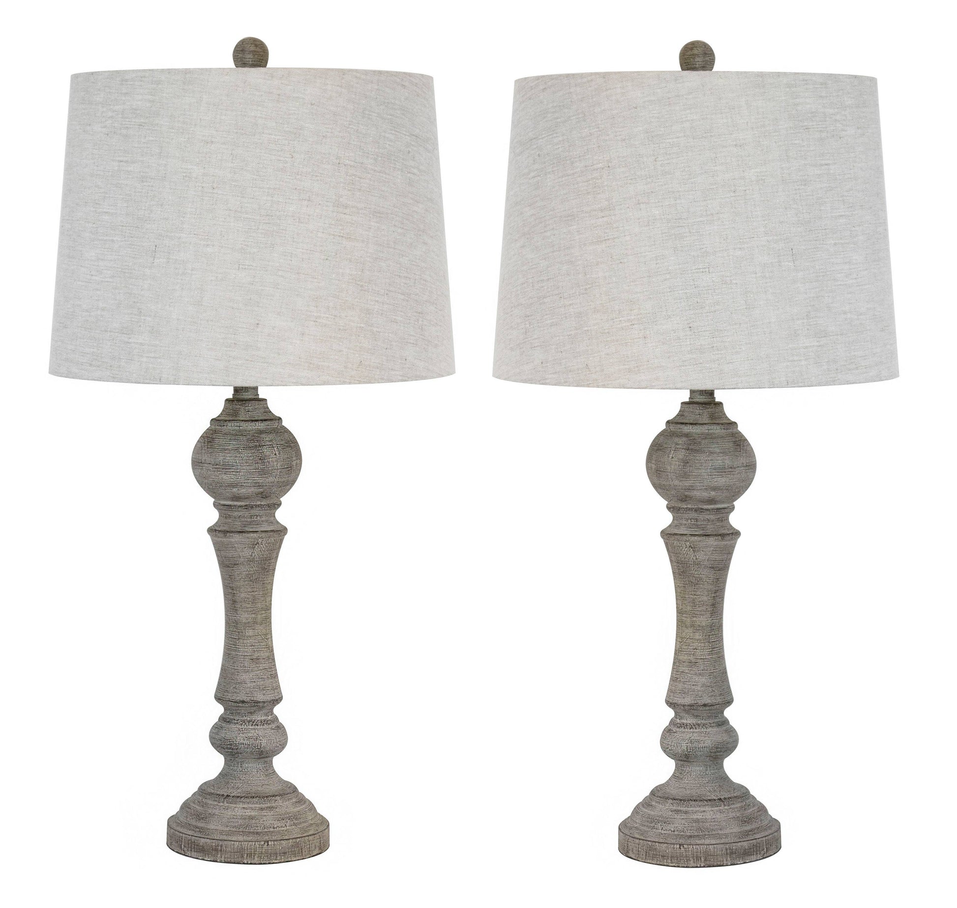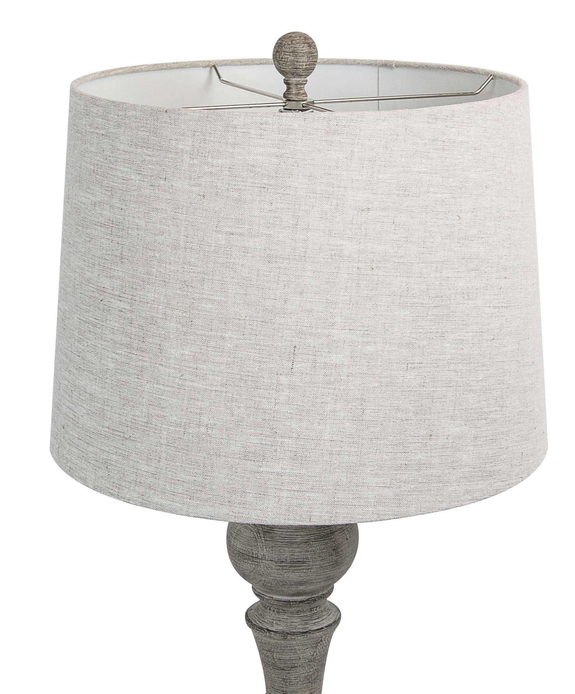 This beautiful polyresin table lamp features an attractive farmhouse chic look, complementing modern and reclaimed design elements. The spindle-like bodies have a reclaimed grey finish, which is a grey-brown color. Paired perfectly with a natural woven linen lamp shade, these lamps' neutral coloring will compliment any room. This lamp is perfect for bedside tables, dressers or any space that you are looking to add some classic yet modern farmhouse decor. Lamp is 32" tall. Round bases are 6.5" wide. Hardback tapered drum shades are 16" at their widest and are 11.5" tall. Each lamp uses one 100-watt maximum "A" bulb (not included) and features an E26 socket with a 3-way switch.