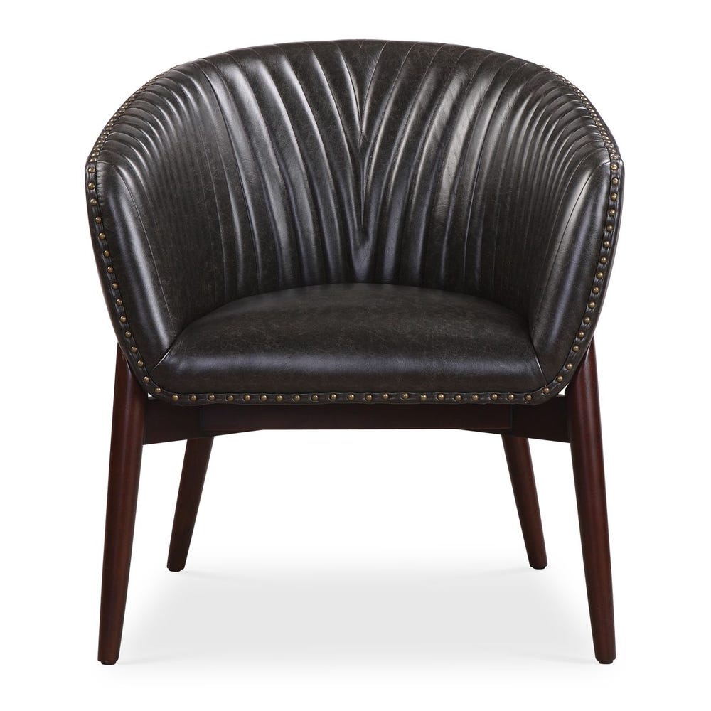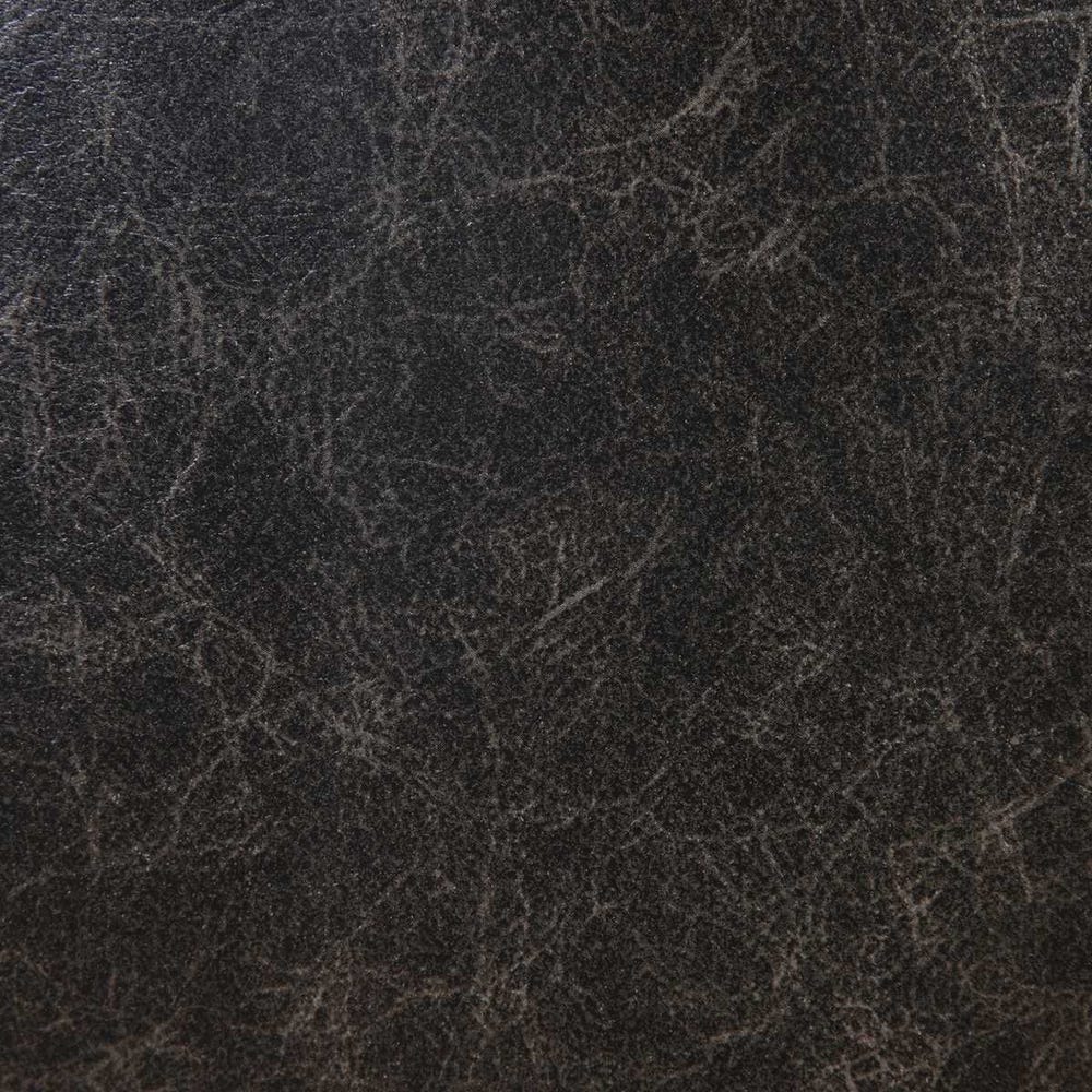 This high style design features a modernized take on Scandinavian style with "V" shaped channel-stitched faux leather, distressed in a casual onyx with contrasting antiqued brass nail head trim. The seat rests in a solid oak wood frame finished in a smooth walnut stain.