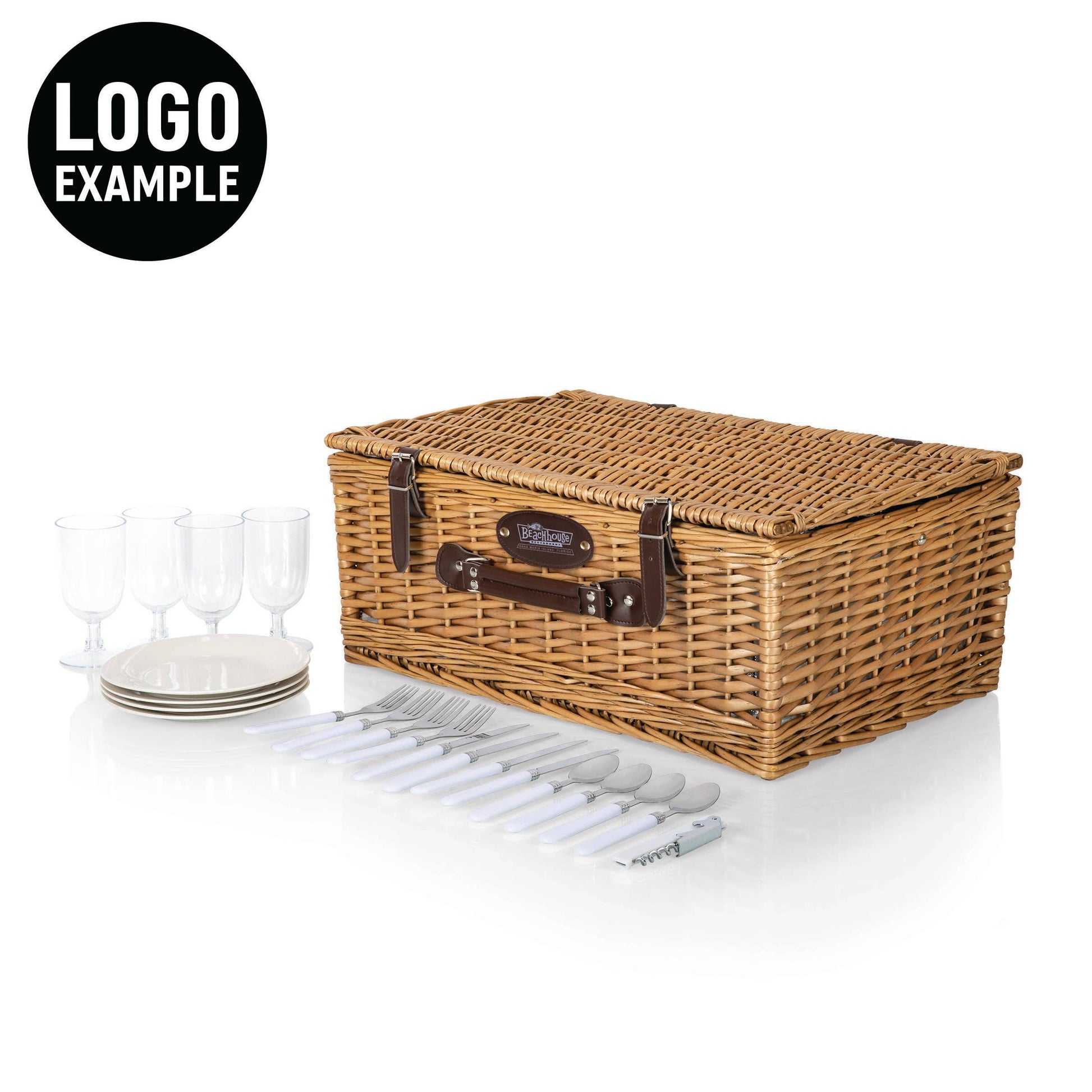 The Belmont Picnic Basket for 4 is a deluxe English picnic basket set loaded with full wine and cheese service for four and plenty of romantic vintage charm. Our willow wicker picnic basket features a durable lining, removable cooler section, plus a wine picnic set with four 100% cotton napkins, alongside plates and silverware for 4 securely attached to the lid with leather straps and 4 wine glasses held in place in the body of the basket with elastic. And there’s still plenty of room for hot and cold foods, wine, cheese, charcuterie and more! With all of the necessary accessories for a perfect picnic, the Belmont picnic basket set is a classy and convenient wedding or anniversary gift for loving couples and families!
