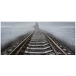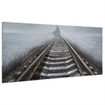 This wall art depicts a locomotive on train tracks with a unique perspective that focuses on the foreground tracks. The piece creates visual depth through dimensional elements.