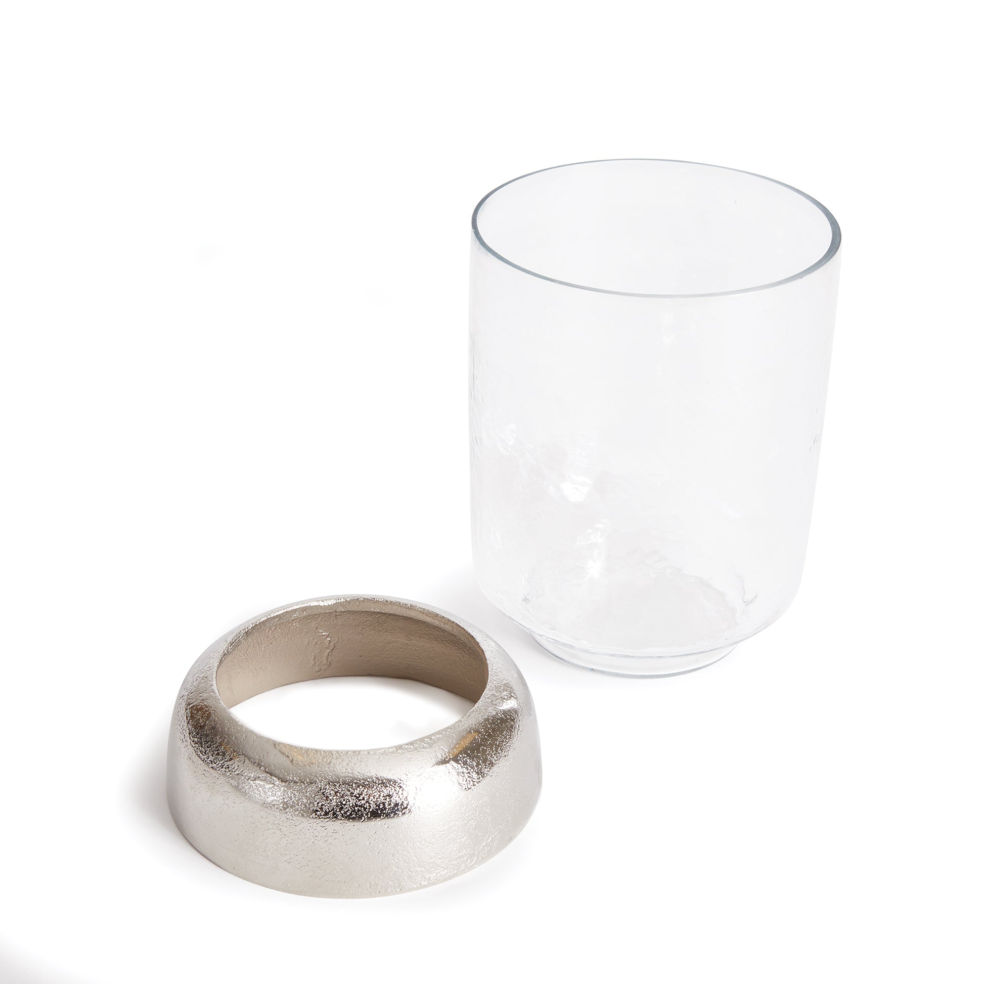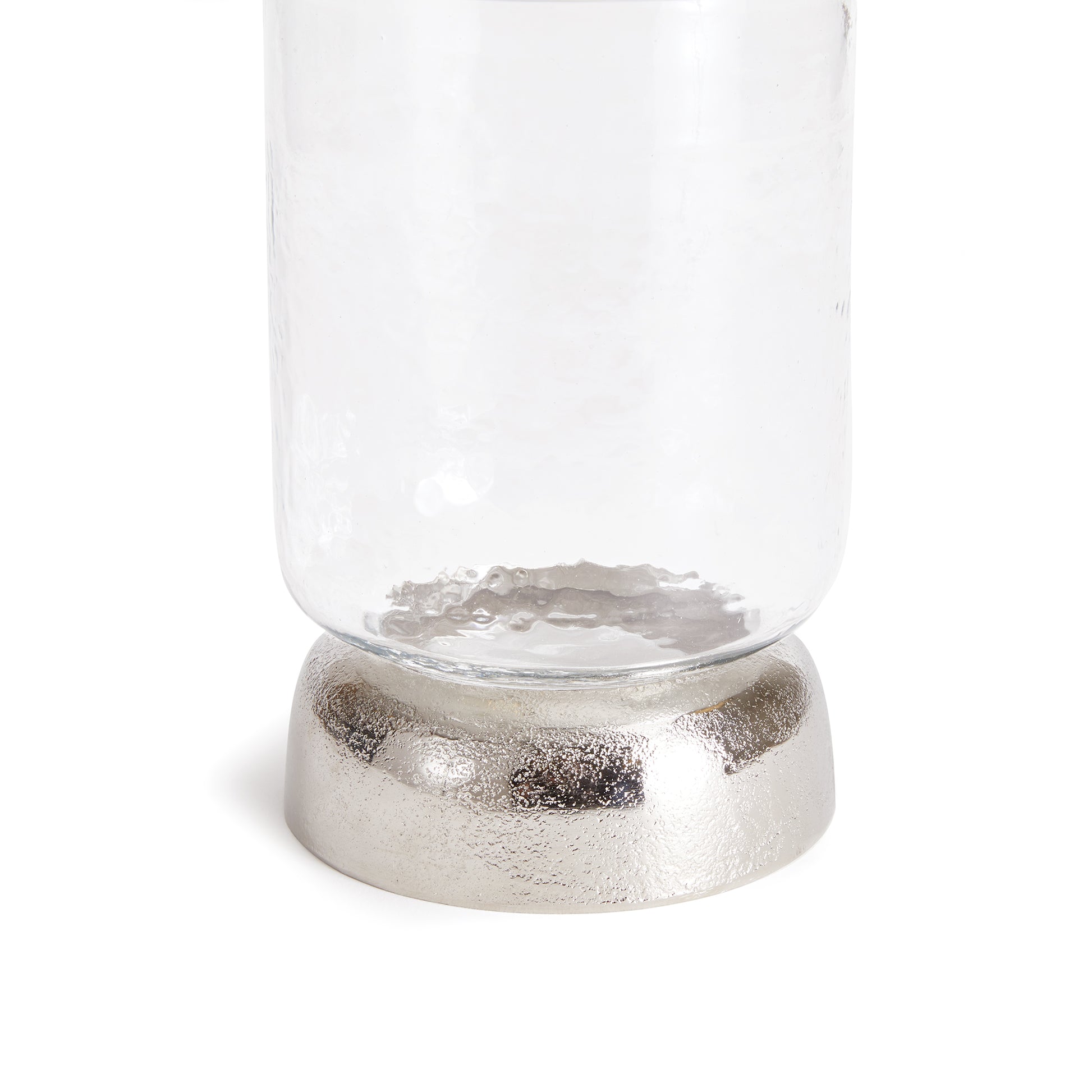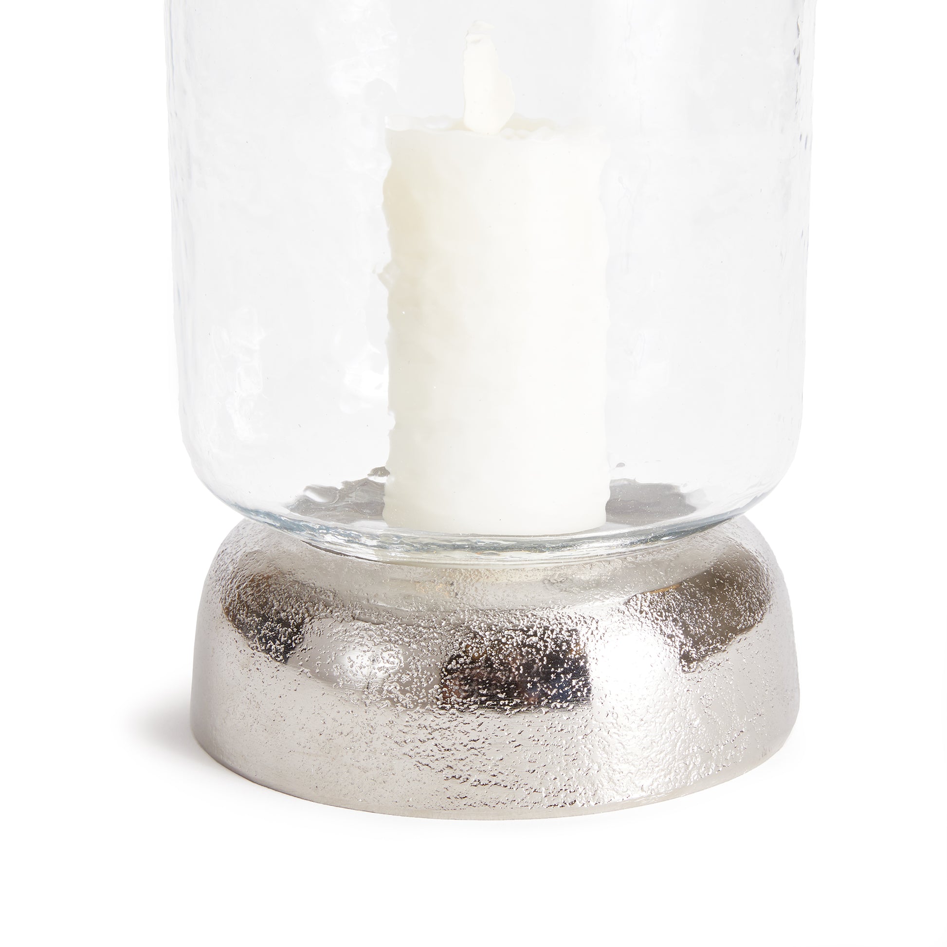 With a cool chrome finish and a domed base, this hurricane is a fresh accent for dining table, console or bookshelf. The hammered glass is sure to naturally enhance a candle's glow.