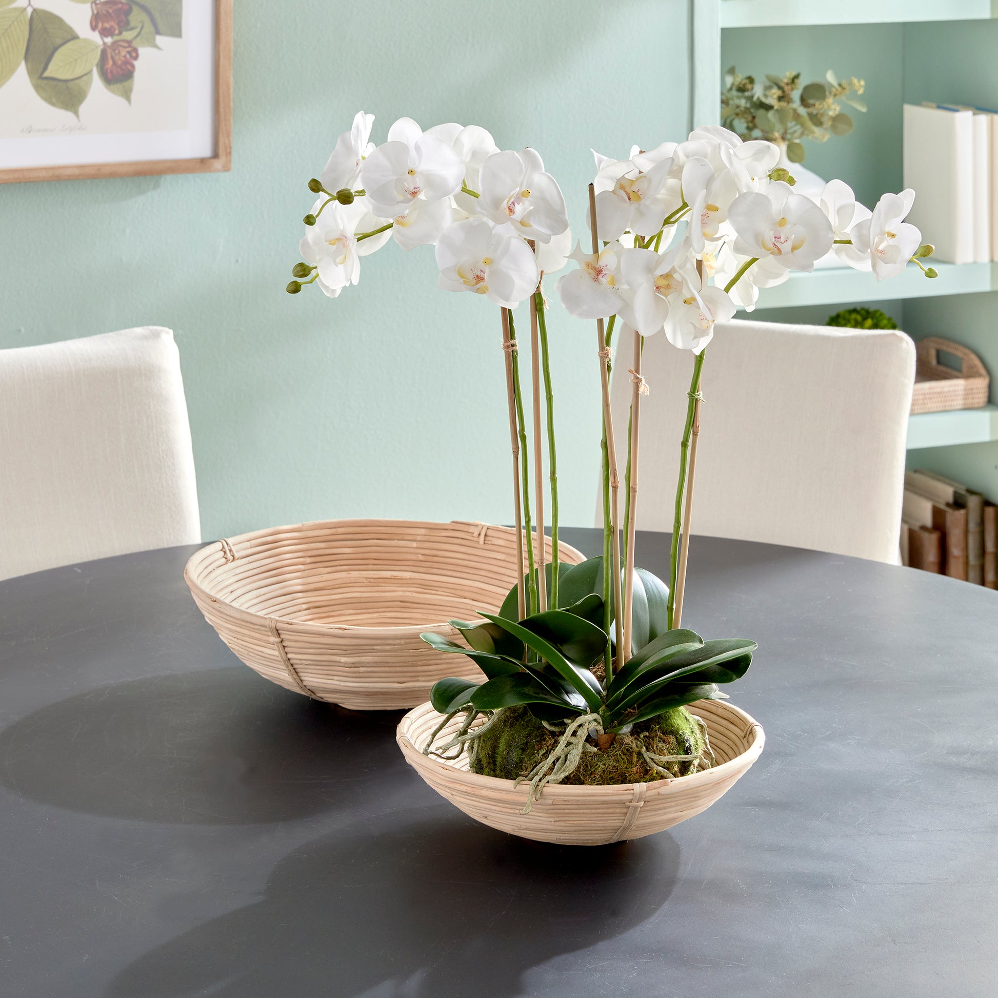 This oversized low bowl cane rattan set of two are stacked, not woven creating a more substantial basket. With a light and refined look, cane rattan is at home in the modern to transitional space.