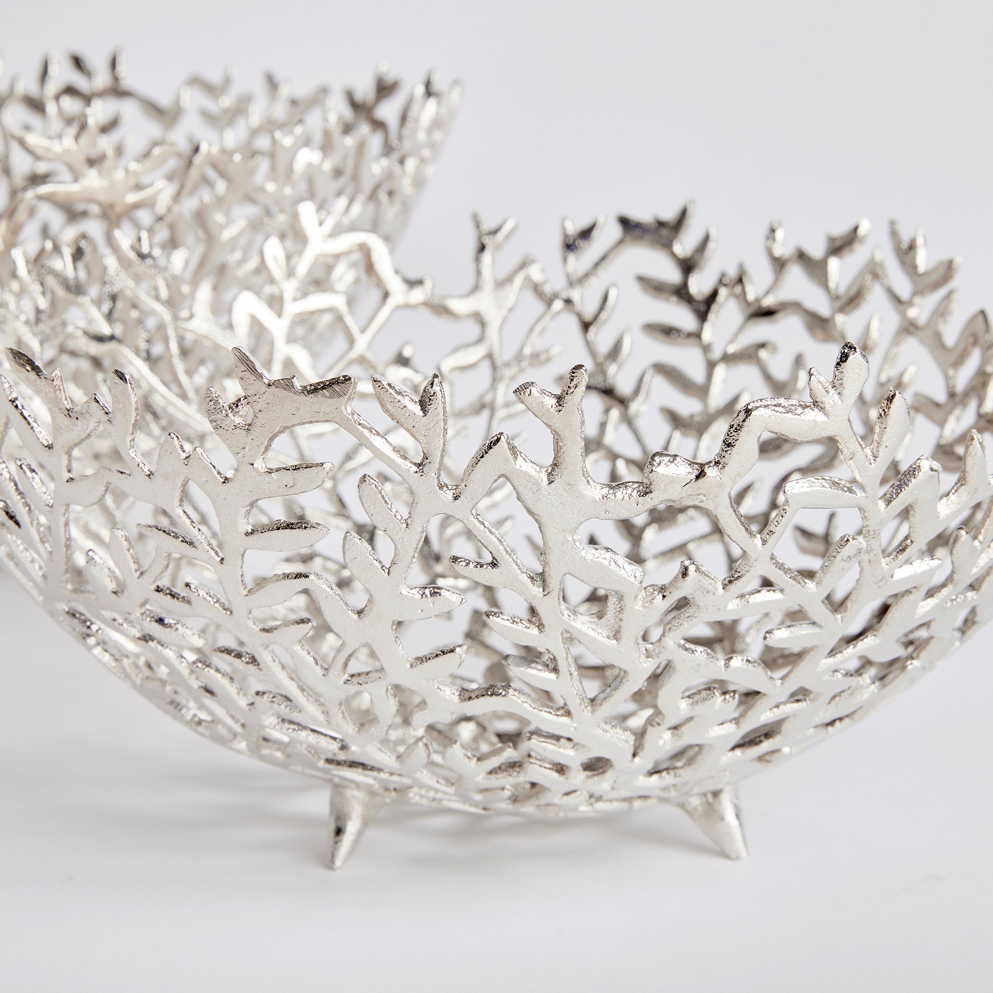 Light flowing vines make up the composition of this pair of silver decorative bowls. Fill with natural green orbs, or display as is for a clean, sophisticated look.