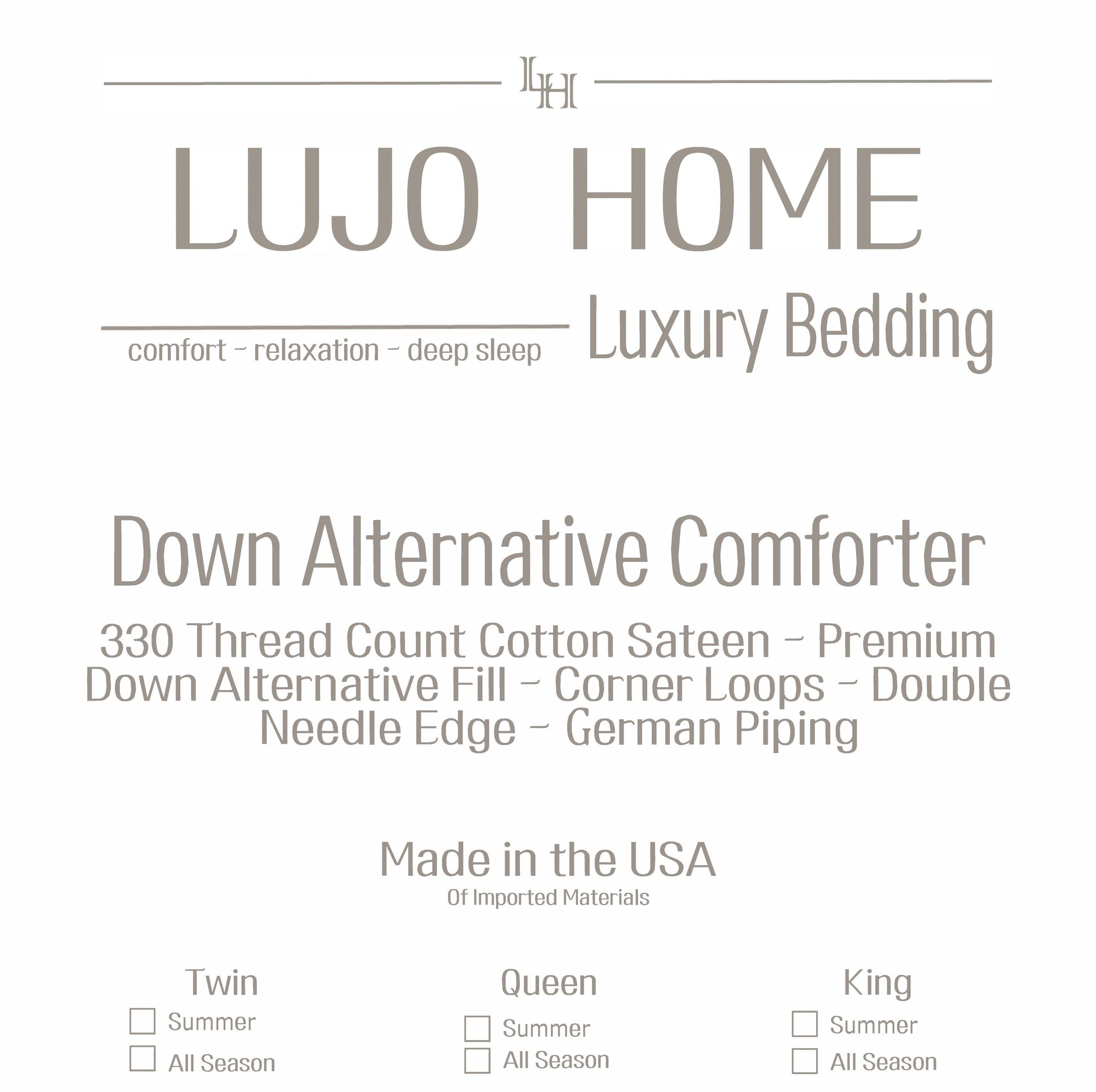 This hypoallergenic all-season comforter is filled with premium down-alternative microfiber, offering the plush feel of down without allergens. The 330TC cotton sateen cover provides a smooth, soft feel, while the baffle box construction ensures even loft distribution and prevents cold spots. It is ideal for year-round comfort and breathability.