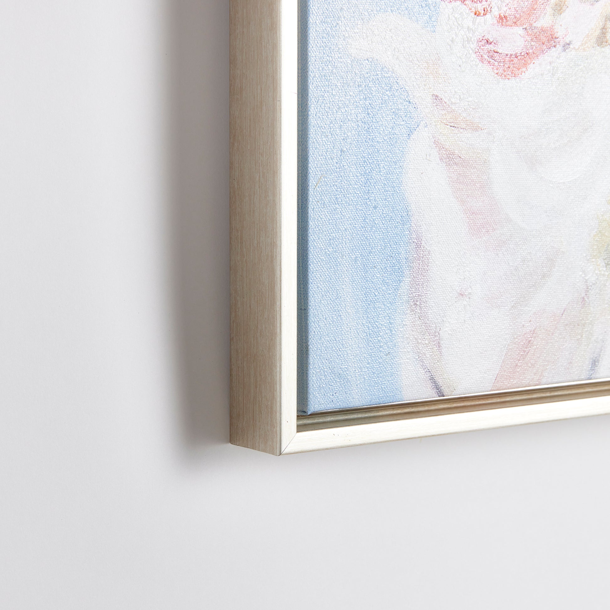 This modern interpretation of a close-up study of a lush and full floral arrangement makes for a striking accent for the wall. Highlights are hand-embellished with touches of paint creating a rich texture and depth. The canvas is finished off beautifully with a sleek silver frame.