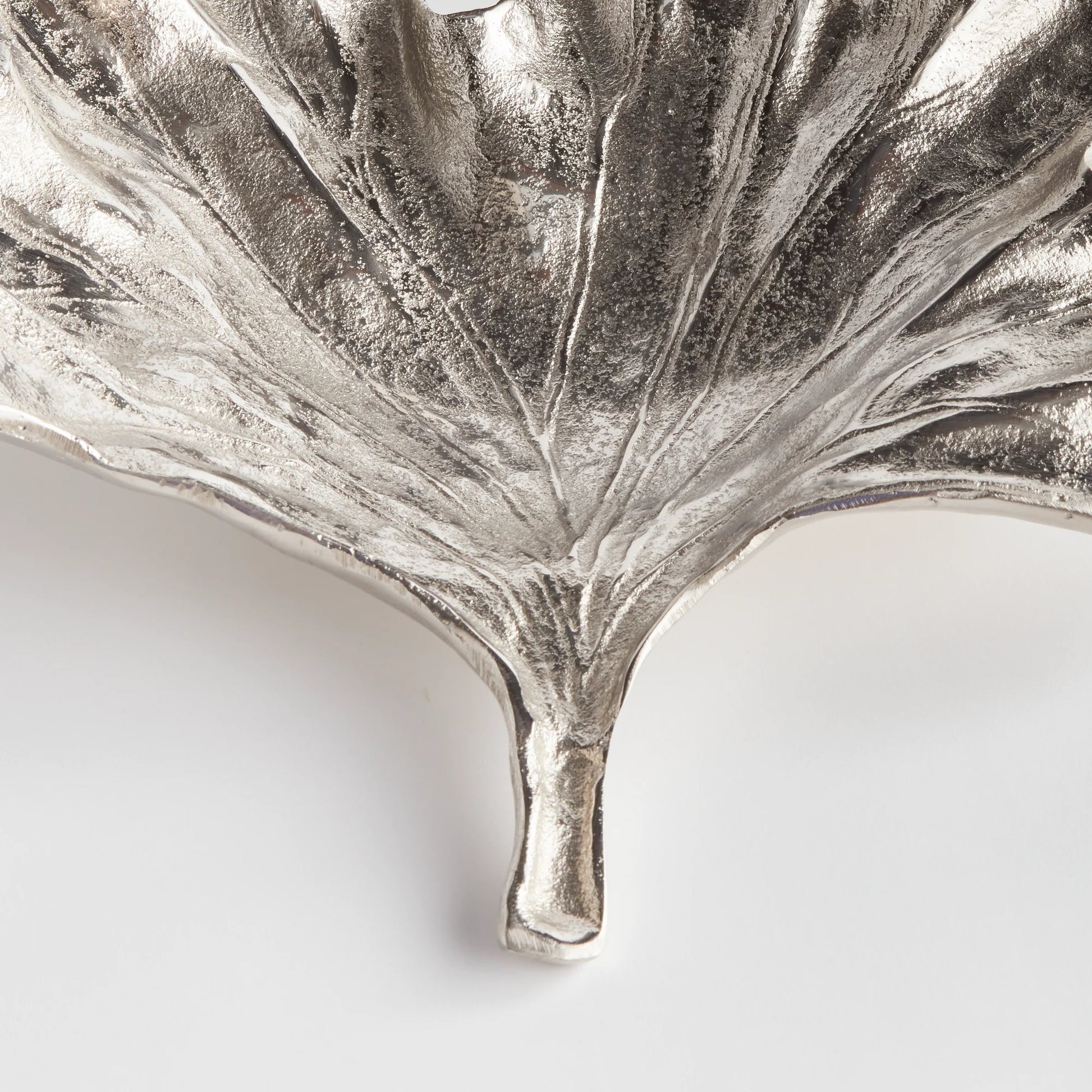 A traditional method of sand casting by hand is what creates the natural leaf details. Made of aluminum, this substantial tray is then finished with a light silver hue. On coffee table, console or countertop, this grand tray adds a fresh, natural touch.