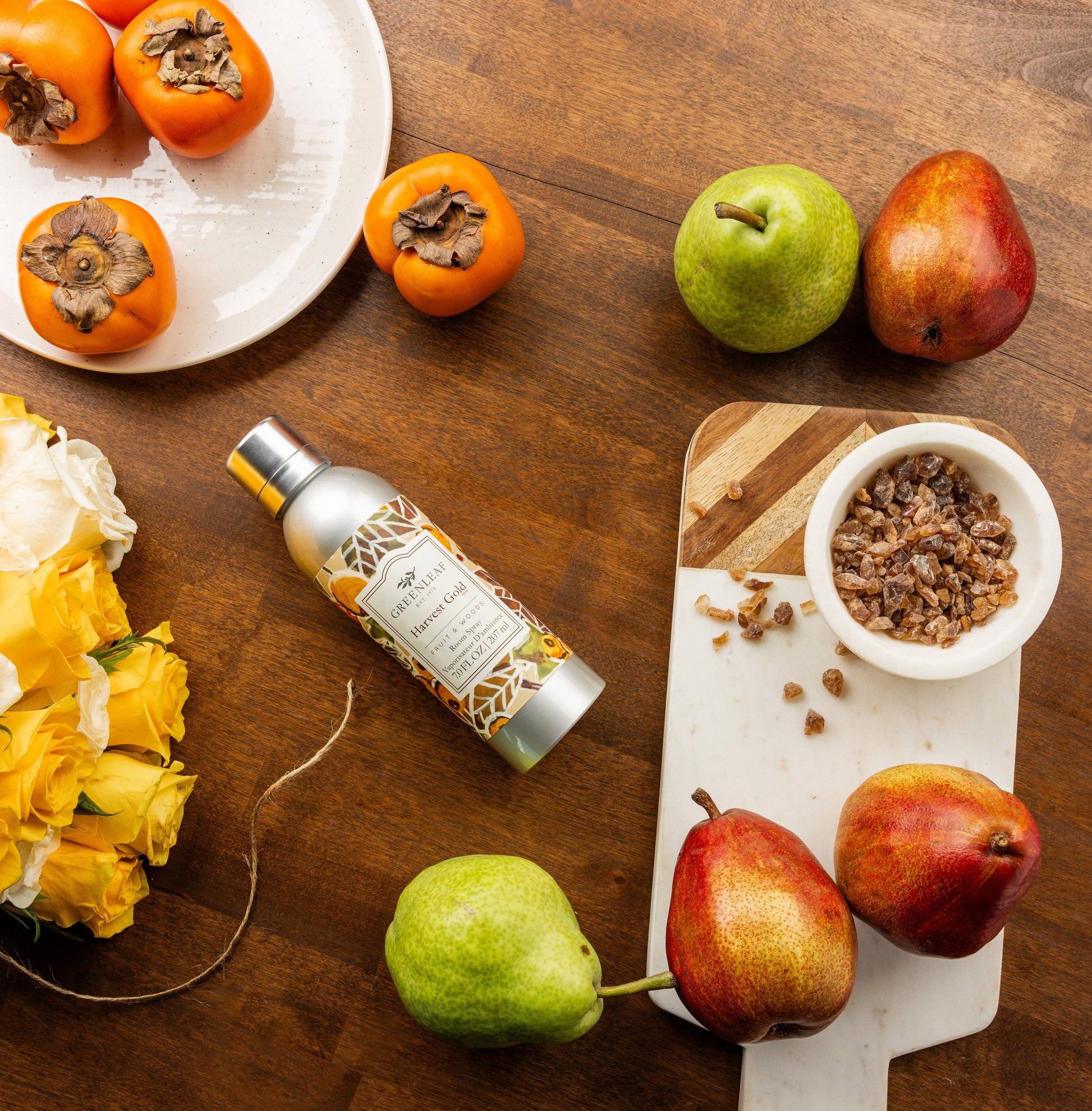 The golden scent of persimmon, orange blossom and cedar wood. Pairs well with fall leaves, mulled wine, and your autumn traditions.