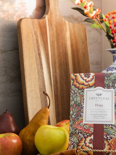 Enjoy your favorite Greenleaf fragrance everywhere you go with our Large Sachets. Place a few in your closets, under the seats in your car, under your sink, or anywhere else you'd like a touch of fragrance. Fragrance Description: With a blend of fresh fruit and warming spices, Hope is the fragrance you've been searching for to make your home feel warm and cozy.