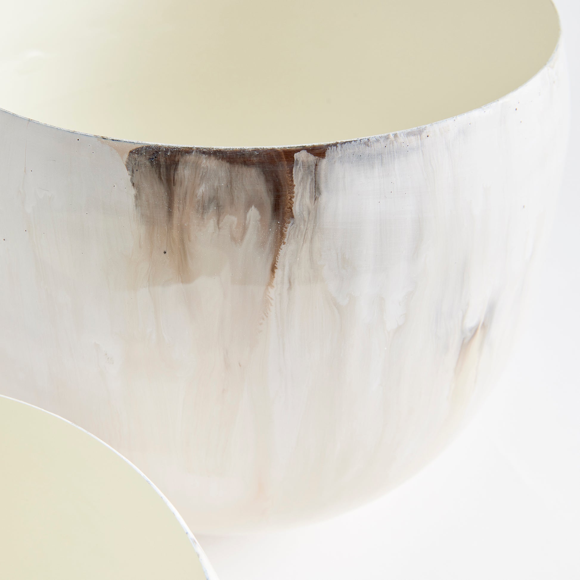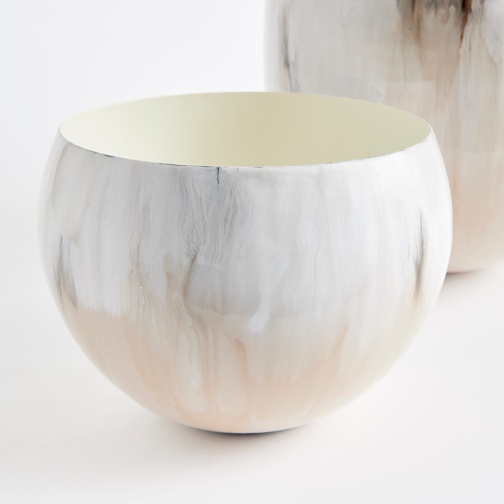 In a clever use of enameled iron, these lightweight cachepots are painted by hand. With a creamy mocha palette inspired by a latte, with layers of milky froth and coffee tones swirling, it is modern artistry defined.