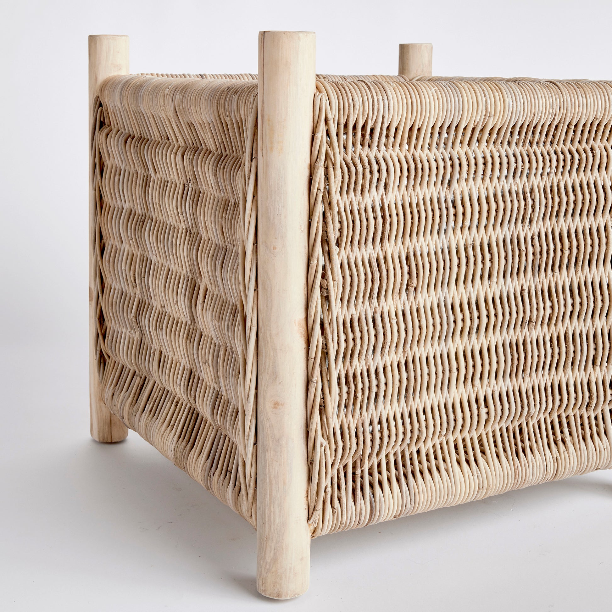 Talk about grand scale! This well-constructed planter has all the bells & whistles. A removable zinc galvanized liner, teak legs, organic all-natural materials, it is quite the statement piece. And did we mention scale?