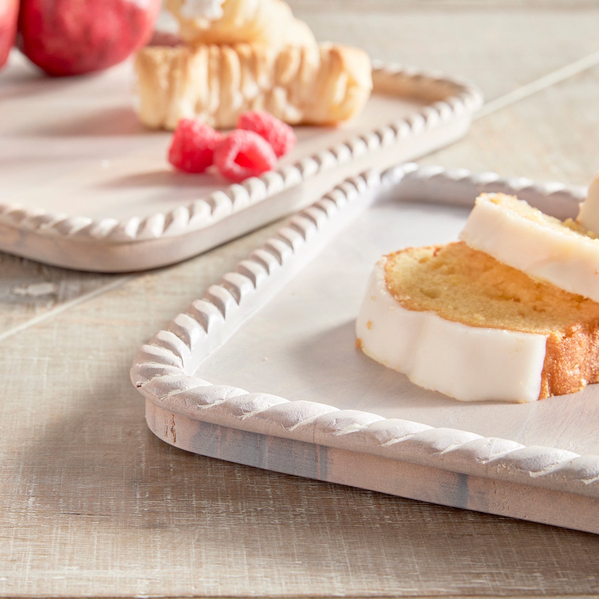 Hand carved from mango wood, this pair of trays is a sweet little accent for baked goods or a cheese tray. A little touch of natural wood tone is always on trend.