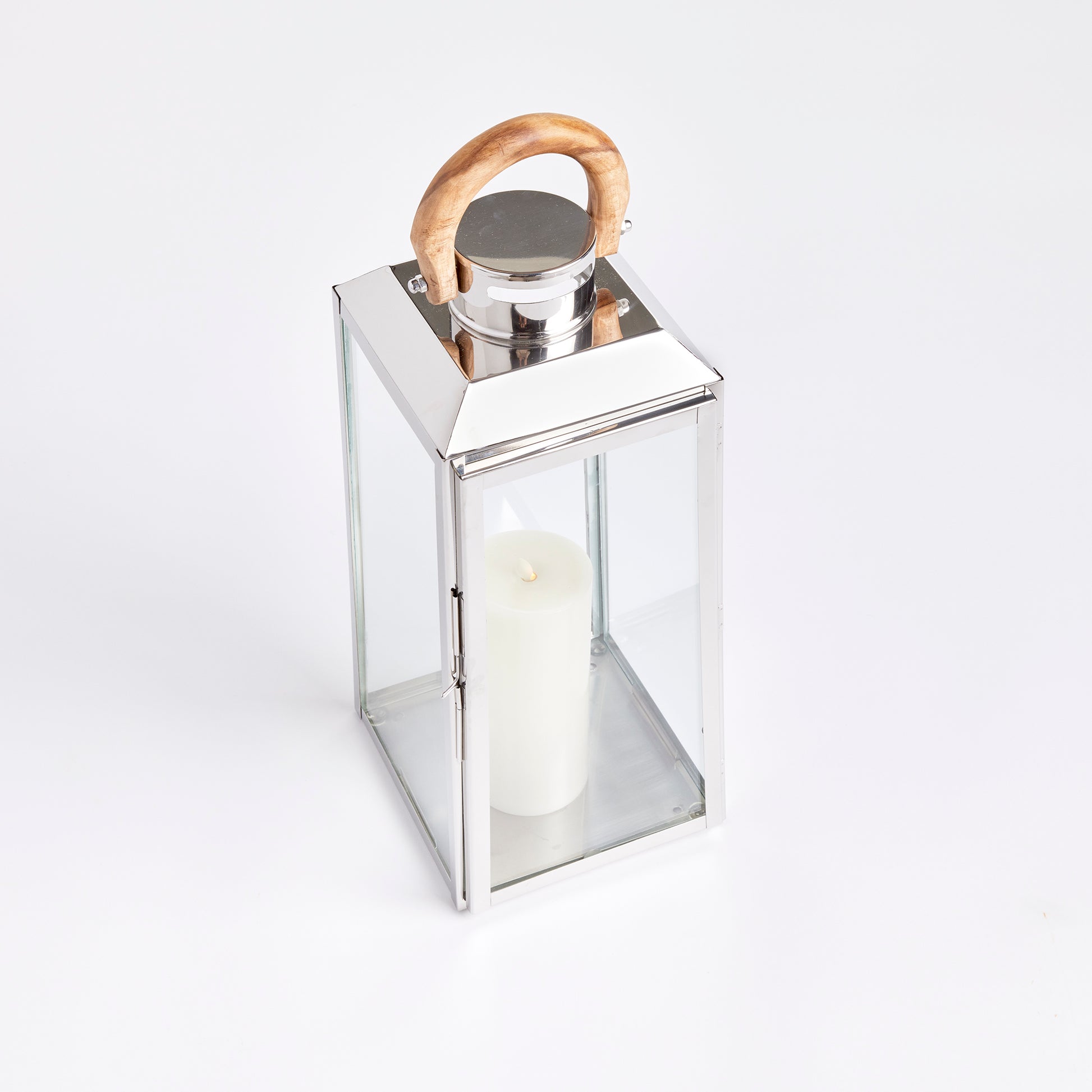 Nautical in style, this handsome outdoor lantern shines brilliantly in a chrome finish and real teak wood handle. Add a couple of pillar candles and it makes a beautiful accent for the front stoop.