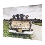 This photograph on glass captures dogs waiting in the bed of a distressed truck against a rural Midwest backdrop with grey clouds and a distant town.