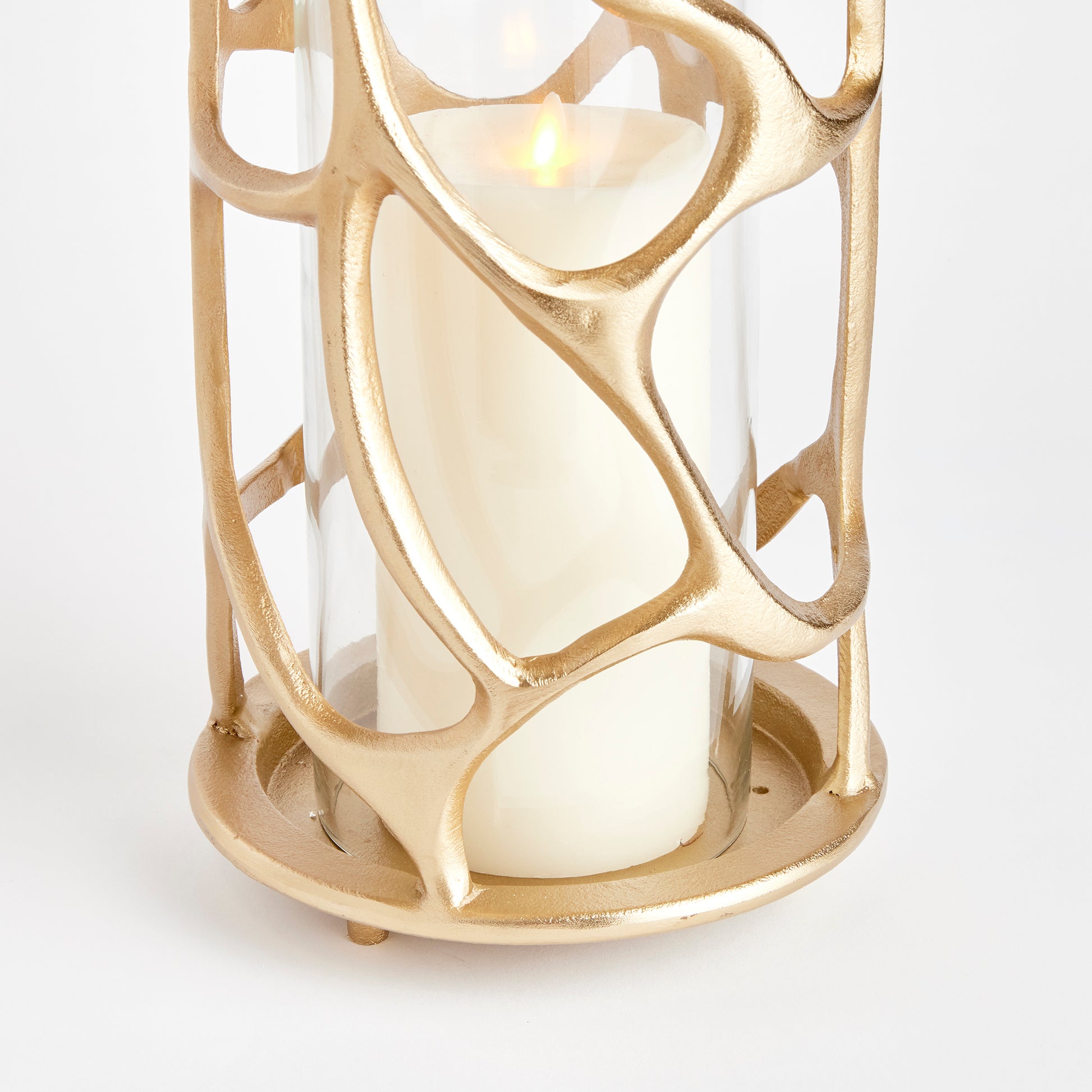 With a hand-sculpted meandering design, you'd never guess this artisan hurricane is made of a sturdy cast aluminum. With a matte gold finish and glass cylinder, it is sure to dress up any modern space.
