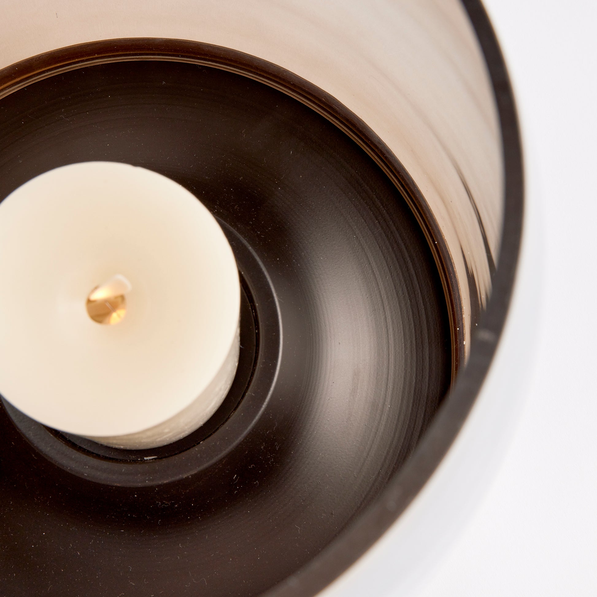 The sweeping tapered base of this contemporary design gives it a floating quality. The warm luster glass hurricane and matte brass finish only add its appeal.