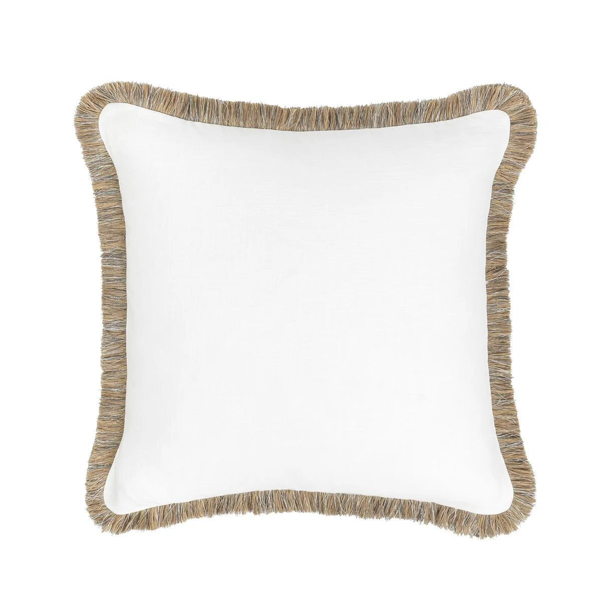 Description: A grounded cotton and linen textured fabric raise the lush texture of fringe around this pillow design. A perfect pillow for layering, a soft feather and down blend insert gives this pillow a lavish supportive feel that makes it as comfortable as it is beautiful.