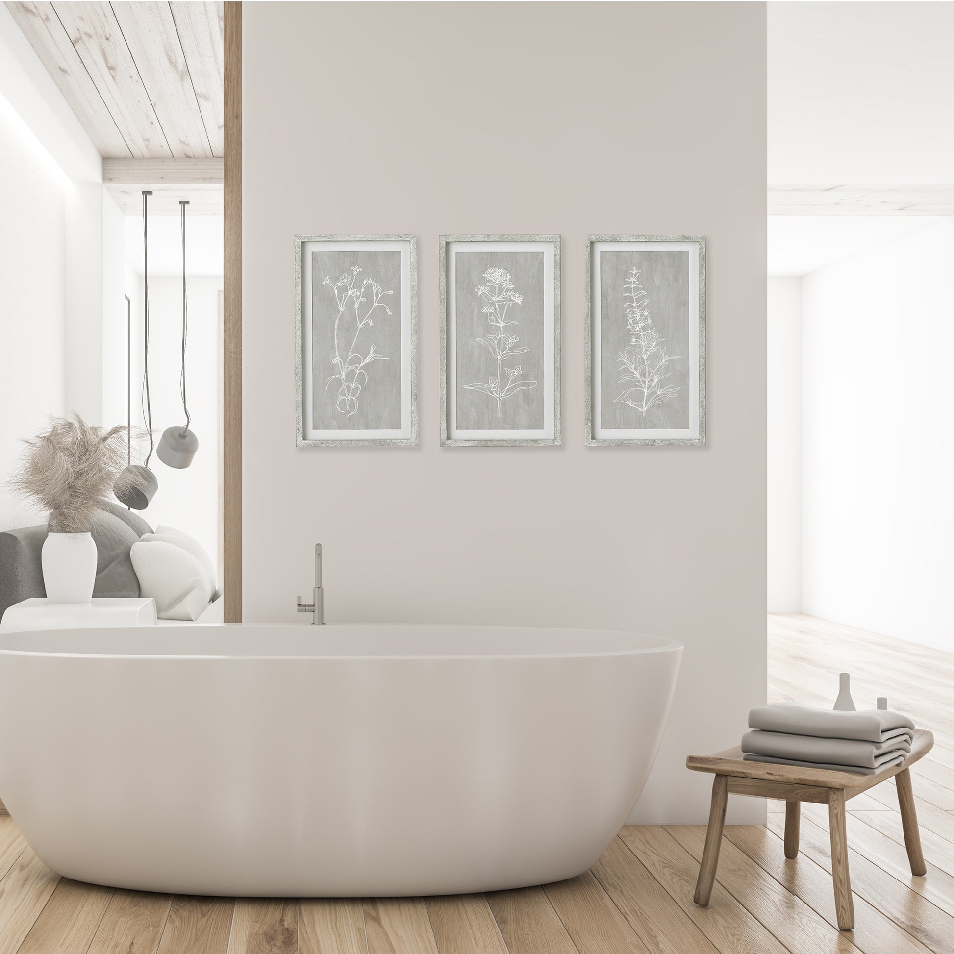 These cool grey wash prints with a light impression of botanical forms is a contemporary trio. Finished with crisp white mats and pine wood frames in a light grey wash.