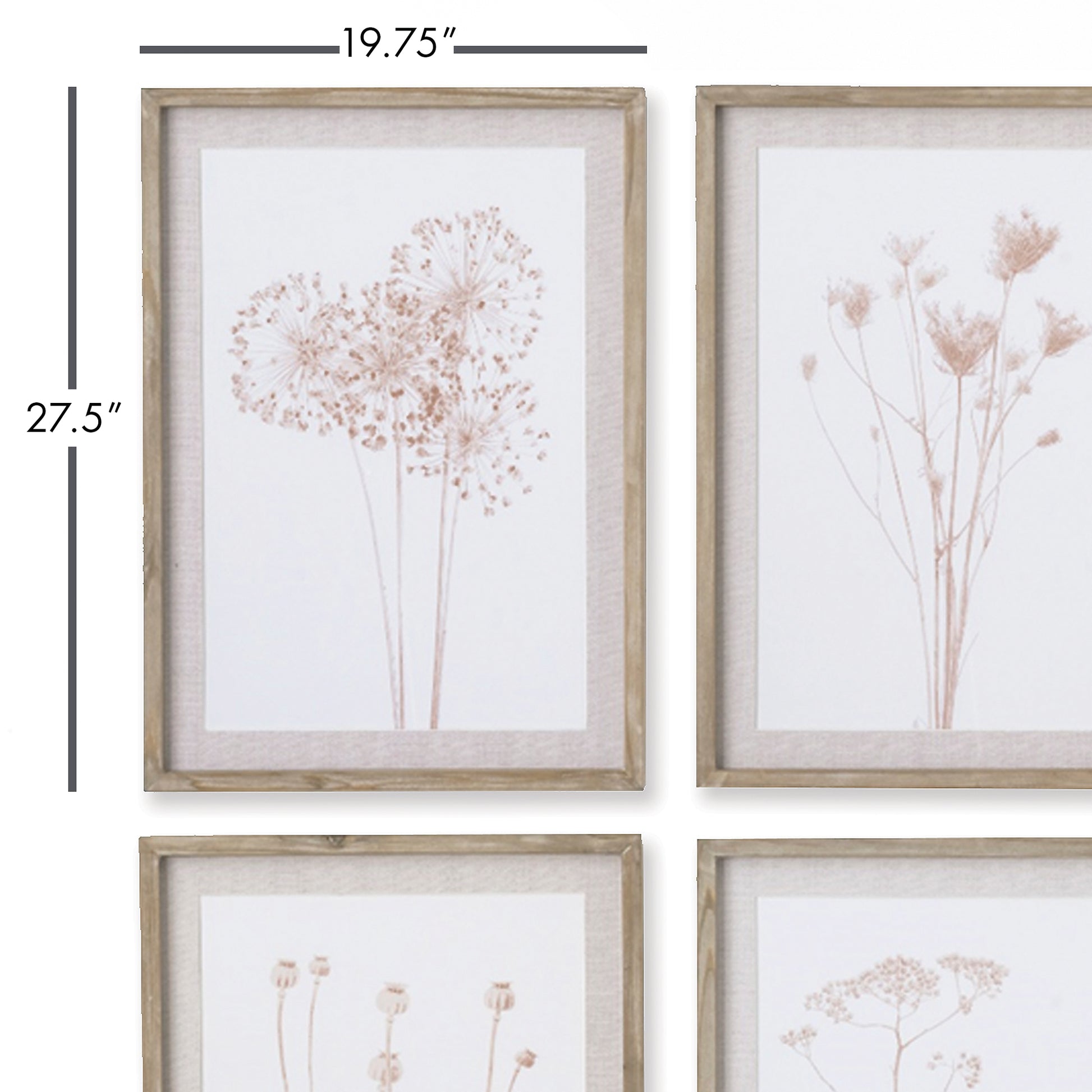 In a subtle sepia tone, this set of 4 assorted botanicals are light and airy. Finished off with a neutral mat and a natural pine wood frame, it makes a lovely accent for foyer, living room or bedroom.